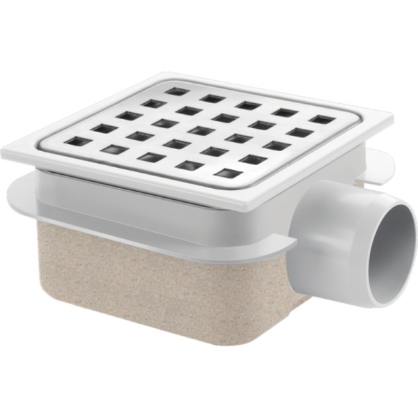 This shower drain has a dimension of 105 x 105 mm. The grating with square holes and the odor trap are easily removable for cleaning purposes. With a drainage capacity of 0.4l/sec, this drain is suitable for most shower areas. The compact installation height makes this shower drain very suitable for bathroom renovations. Due to the casing of high-quality ABS plastic, the drain is easy to glue with PVC glue. The plastic upper edge is adjustable in height which makes installation easy. Diameter of the under drain is 40 mm.
