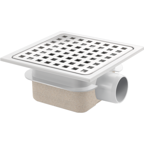 This shower drain has a dimension of 150×150 mm. The grating with square holes and the odor trap are easily removable for cleaning purposes. With a drainage capacity of 0.4l/sec, this drain is suitable for most shower areas. The compact installation height makes this shower drain very suitable for bathroom renovations. Due to the casing of high-quality ABS plastic, the drain is easy to glue with PVC glue. The plastic upper edge is adjustable in height which makes installation easy. Diameter of the bottom drain is 40 mm.